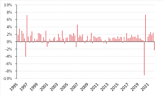 Pomijając zdarzenia jednorazowe (pandemia i osobliwe, prawdopodobnie związane z nieudanym odsezonowaniem, wahnięcie na przełomie 1996 i 1997), był to najgorszy kwartał w historii szeregu, choć trzeba pamiętać, że na początku roku polska gospodarka nie funkcjonowała w całkowicie normalnych warunkach, więc i ten odczyt ma w sobie coś jednorazowego.