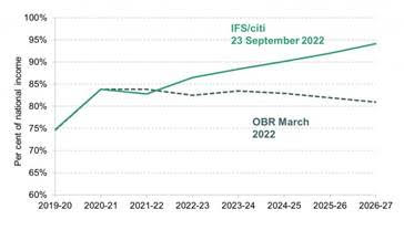 O przyczynach tej wyprzedaży pisaliśmy już wcześniej, dlatego jedynie zrekapitulujemy. Nowy rząd planuje największe od półwiecza cięcia podatków osobistych (obejmuje to odwrócenie wcześniejszych podwyżek, przyspieszenie zapowiedzianych cięć i dodatkowe obniżki stawek). Można zakładać, że cięcia te zostaną zrównoważone (w duchu wcześniejszych rządów Torysów) obniżkami wydatków, ale póki co nic takiego nie zostało ogłoszone, rynki reagowały więc na plan podatkowy. Z czysto fiskalnego punktu widzenia stanowi on permanentne obniżenie wpływów podatkowych o ok. 2 pkt. proc. PKB i asumpt do zamiany płaskiej ścieżki długu publicznego na wzrostową (por. wykres z analizy IFS). Rynki zareagowały jak zareagowały i wyceniły solidną dawkę dodatkowego zacieśnienia ze strony Banku Anglii.