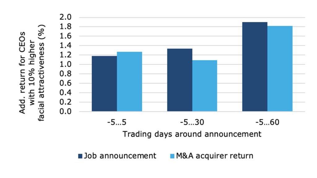 Naukowcy na bazie FAI przeanalizowali, jak zachowywały się kursy akcji na wieść o nominacji danej osoby na fotel szefa spółki (ang. job announcement), a także gdy zarządzana przez atrakcyjnego człowieka firma ogłaszała transakcję fuzji i przejęć (ang. M&A acquirer return). W obu przypadkach występował związek między pięknem menedżera a stopą zwrotu z akcji. Ci, których charakteryzowała atrakcyjność o co najmniej 10% wyższa niż przeciętna, zapewniali akcjom swoich korporacji dodatkowy zysk w wysokości ok. 1-2% w zależności od przyjętego interwału czasowego.